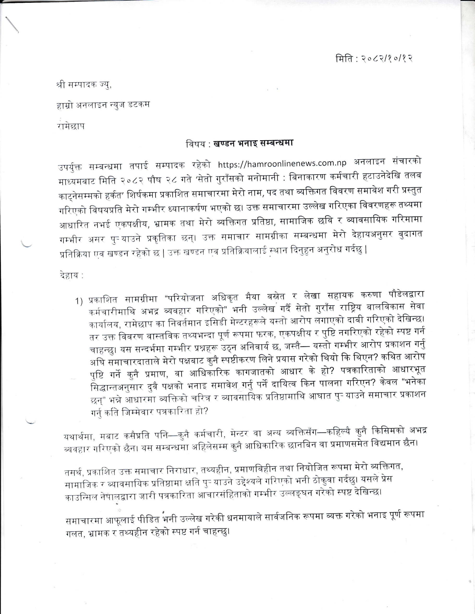 रामेछाप- प्रेस काउन्सिल नेपालबाट मिति २०८२ माघ २० गते प्राप्त इमेल तथा पत्र सङ्ख्या ०८२/८३, च.नं. ७०५ बमोजिम मिति २०८२ पुष २८ गते “सेतो गुराँसको मनोमानी, बिनाकारण कर्मचारी हटाउनेदेखि तलब काट्ने सम्मको हर्कत” शीर्षकमा हाम्रो अनलाइन न्यूज डटकममा प्रकाशित समाचार सम्बन्धी खण्डनलाई स्थान दिन दिएको निर्देशनअनुसार समाचार खण्डनलाई स्थान दिइ प्रकाशन गरिएको छ । साथै, हाम्रो सञ्चारमाध्यम सधैँ पत्रकार आचारसंहिता तथा पेशागत मर्यादा पालना गर्न पूर्ण प्रतिबद्धसमेत रहेको छ ।