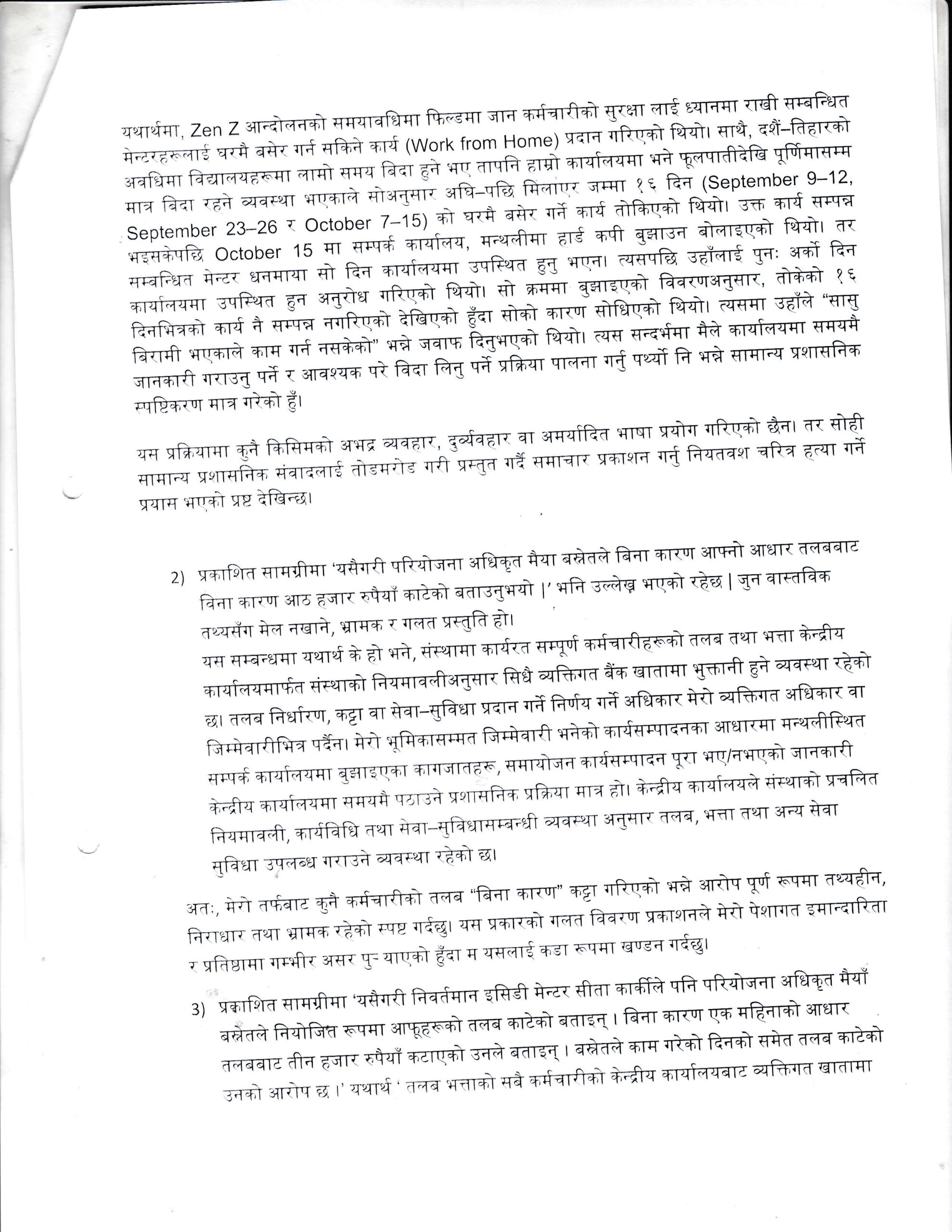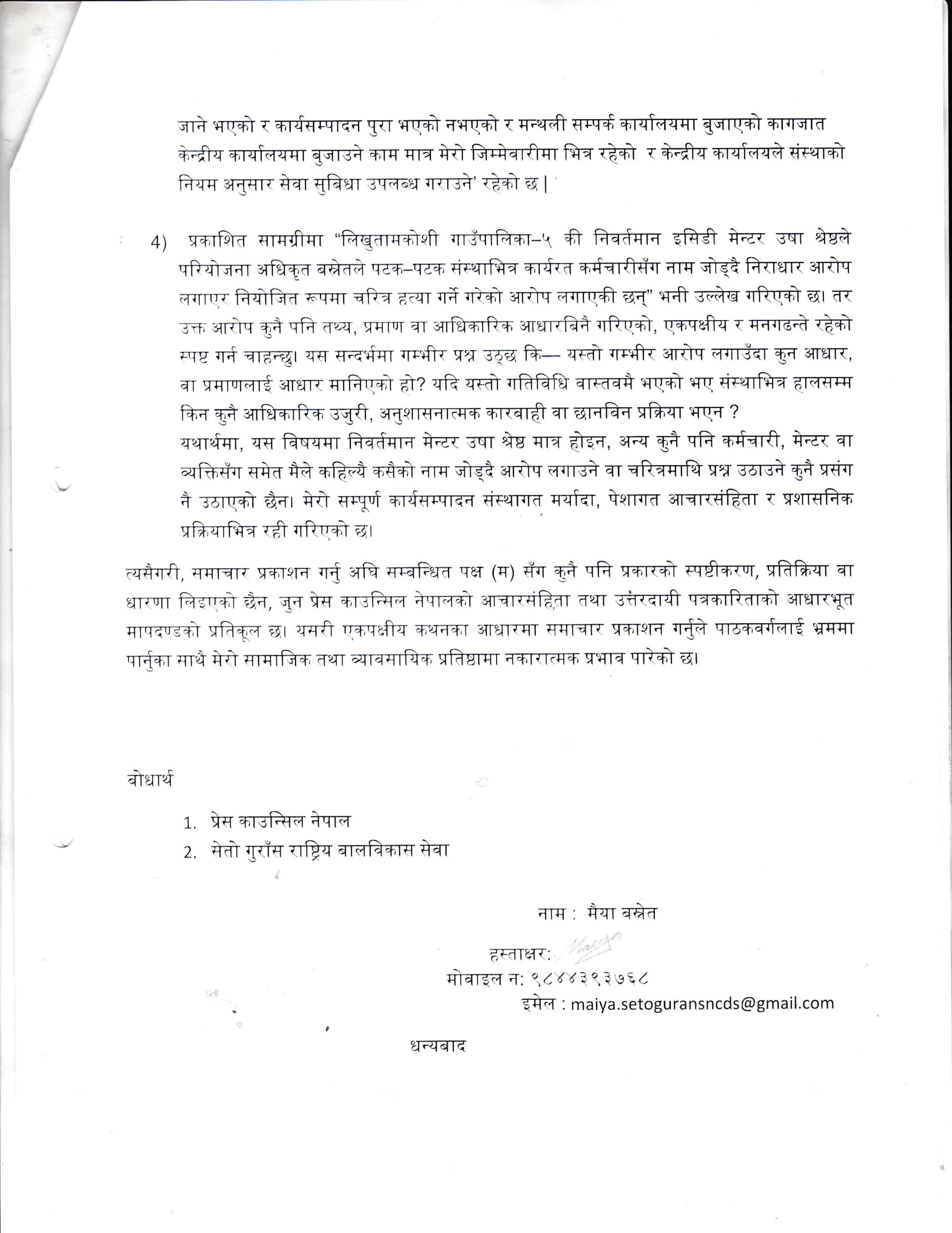 काउन्सिलको निर्देशन तथा सम्बन्धित पक्षलाई खण्डन गर्ने अधिकारको सम्मान गर्दै खण्डन प्रकाशन गरिएको भए पनि प्राप्त खण्डनमा उल्लेख गरिएझैँ समाचार एकपक्षीय र तथ्यहीन नभएको दावी भने हामी पेश गर्दछौँ ।