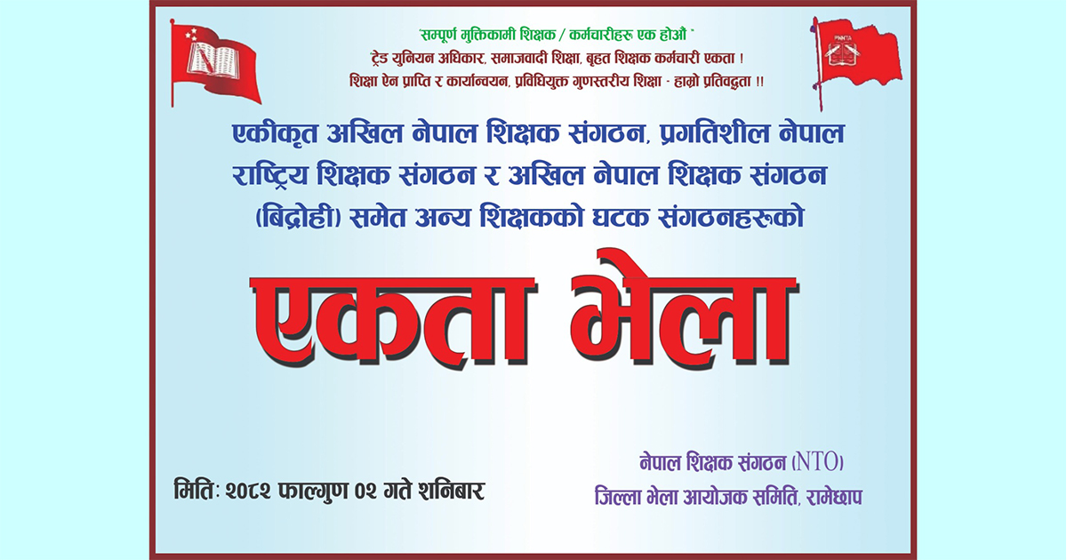 “सम्पूर्ण मुक्तिकामी शिक्षक/कर्मचारीहरू–एक होऔँ !” भन्ने नारासहित तीन शिक्षक सङ्गठनहरूको संयुक्त एकता भेला सम्पन्न भएको हो । “ट्रेड युनियन अधिकार, समाजवादी शिक्षा, बृहत शिक्षक–कर्मचारी एकता ! शिक्षा ऐन प्राप्ति र कार्यान्वयन, प्रविधियुक्त गुणस्तरीय शिक्षा–हाम्रो प्रतिबद्धता !!” भन्ने मूल नाराका साथ आयोजित उक्त भेलाले शिक्षक तथा कर्मचारीहरूबिच एकता, अधिकार र शैक्षिक रूपान्तरणको साझा अभियानलाई अघि बढाउने निर्णय गरेको छ ।