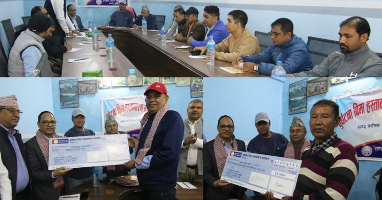 रामेछाप- रामेछाप उद्योग वाणिज्य सङ्घले दुर्घटनामा परेका आफ्ना दुई जना सदस्यहरुलाई बिमा रकम हस्तान्तरण गरेको छ । बिहिवार रामेछाप उद्योग वाणिज्य सङ्घको बैठक कक्षमा एक औपचारिक कार्यक्रम आयोजना गरी उद्योग वाणिज्य सङ्घका सदस्य मन्थली नगरपालिका–१ का राजनबहादुर बुढाथोकी र उमाकुण्ड गाउँपालिका–२ बाम्तीभण्डारका साङ्गे लामा शेर्पालाई बिमा रकम हस्तान्तरण गरिएको हो । मन्थलीका बुढाथोकीलाई ७५ हजार […]